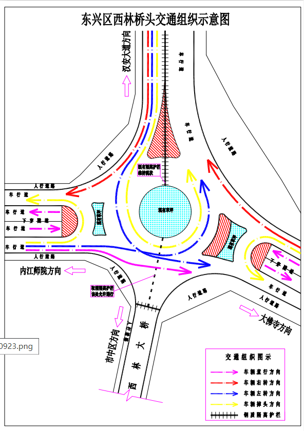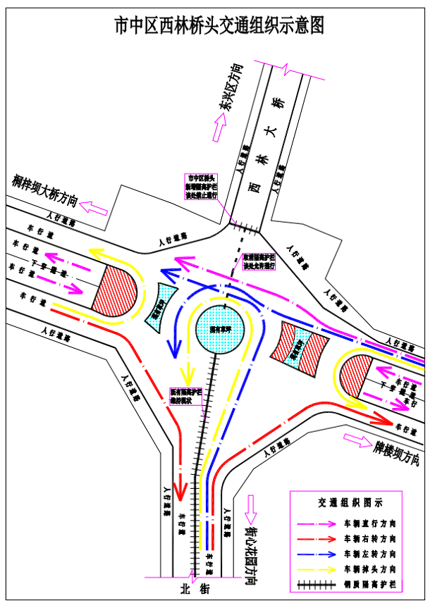 2.西林大桥南北转盘东西方向过往车辆仍经下穿隧道通行,南北转盘靠近西林大桥一端的隔离护栏撤除,由西林大道、北街方向往西林大桥方向行驶的车辆可经转盘调头或者左转,东桐路方向往临江路、西林大道方向行驶的车辆可经北转盘通行,河坝街方向往大洲路、北街方向行驶的车辆可经南转盘通行。