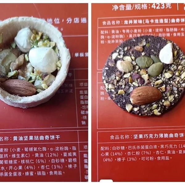 他发现礼盒中的“坚果巧克力薄脆曲奇饼干”中多了疑似南瓜子仁的配料,同时“黄油坚果挞曲奇饼干”里的杏仁口感不对。
