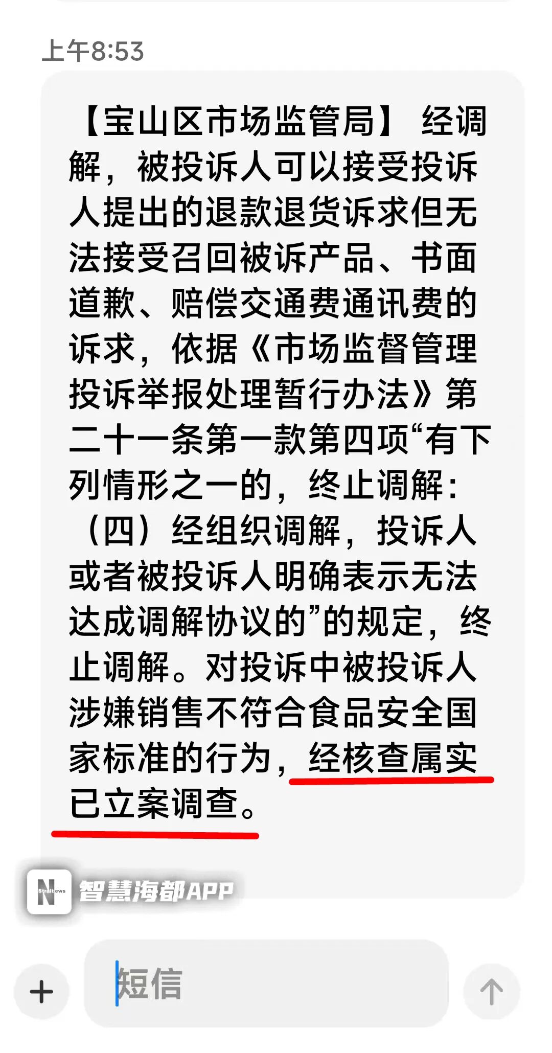 3月13日,上海市宝山区市场监管局短信反馈称:“对投诉中被投诉人涉嫌销售不符合食品安全国家标准的行为,已立案调查。”