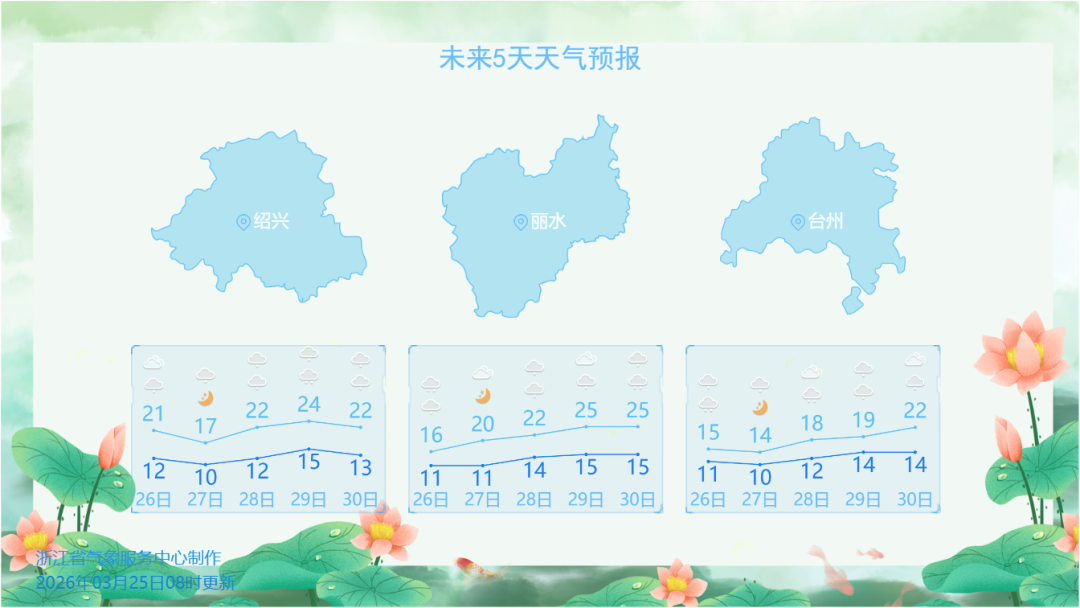 今天:浙中南地区阴有阵雨局部雷雨,部分中到大雨,局地可伴有短时暴雨;其它地区多云转阴有阵雨。