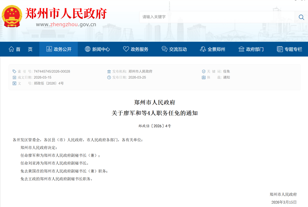 任命廖军和为郑州市人民政府副秘书长(兼);