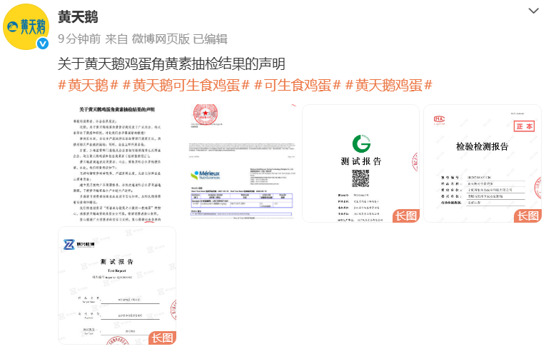 今天(3月25日)15时许,黄天鹅发布“关于黄天鹅鸡蛋角黄素抽检结果的声明”: