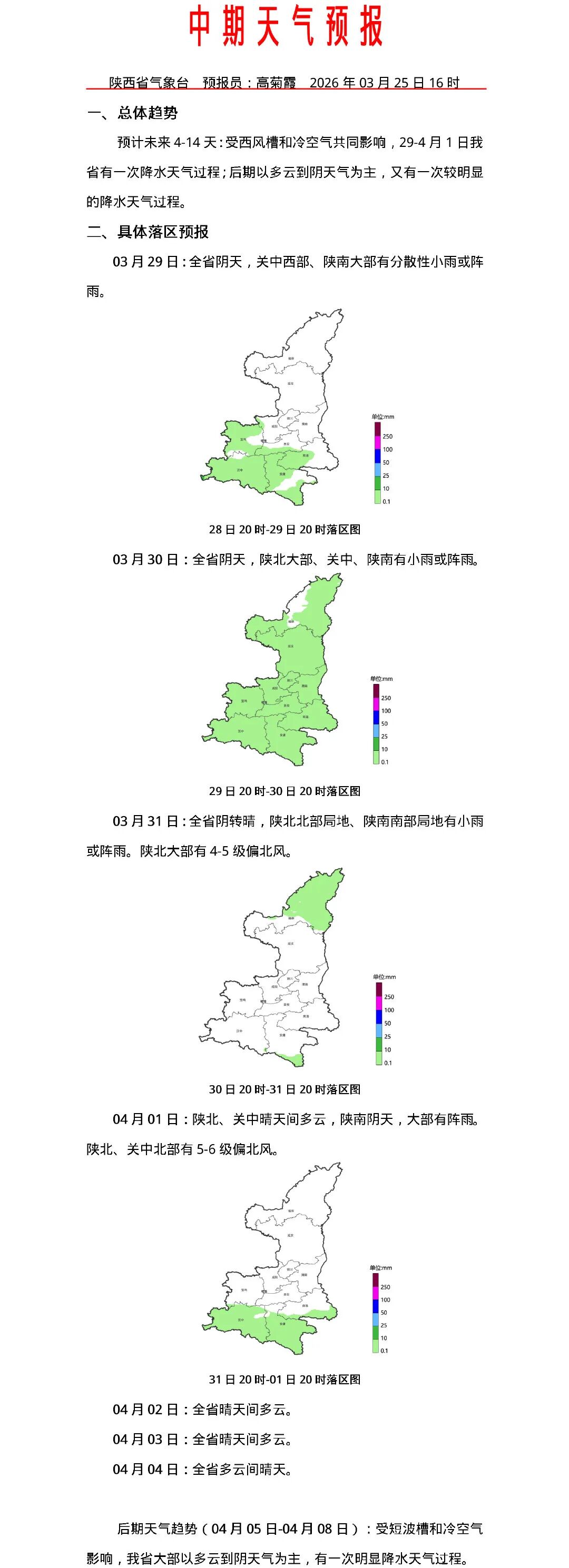 预计未来4—14天:受西风槽和冷空气共同影响,3月29日—4月1日陕西有一次降水天气过程;后期以多云到阴天气为主,又有一次较明显的降水天气过程。