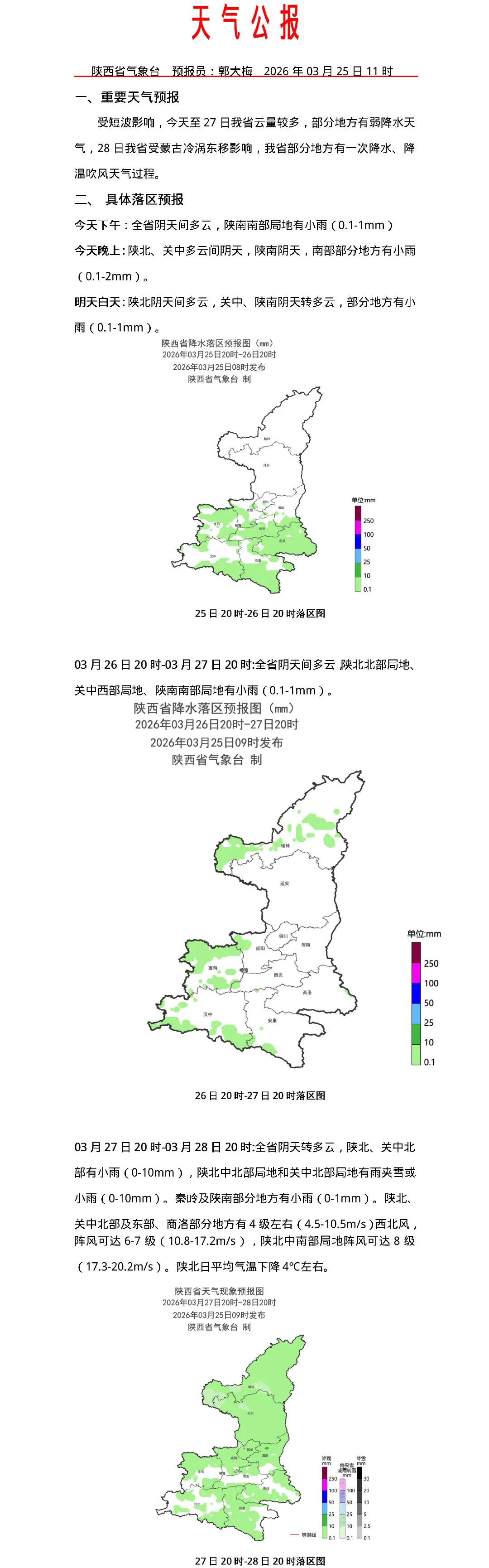 受短波影响,今天至27日陕西云量较多,部分地方有弱降水天气,28日受蒙古冷涡东移影响,部分地方有一次降水、降温吹风天气过程。