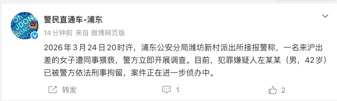 2026年3月24日20时许,浦东公安分局潍坊新村派出所接报警称,一名来沪出差的女子遭同事猥亵,警方立即开展调查。目前,犯罪嫌疑人左某某(男,42岁)已被警方依法刑事拘留,案件正在进一步侦办中。