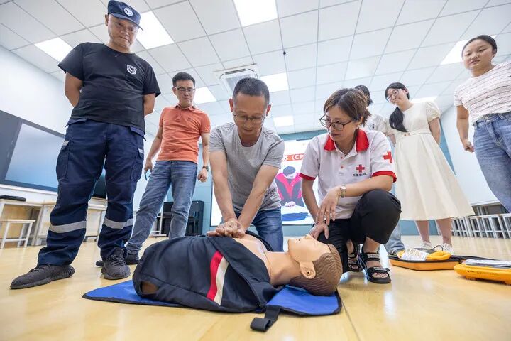 在浙江省湖州市吴兴区龙泉小学,红十字会救护员对教职工进行自动体外除颤器(AED)使用培训。新华社发(伊凡摄)