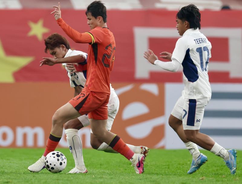 中国U23男足封堵泰国U23男足的进攻。