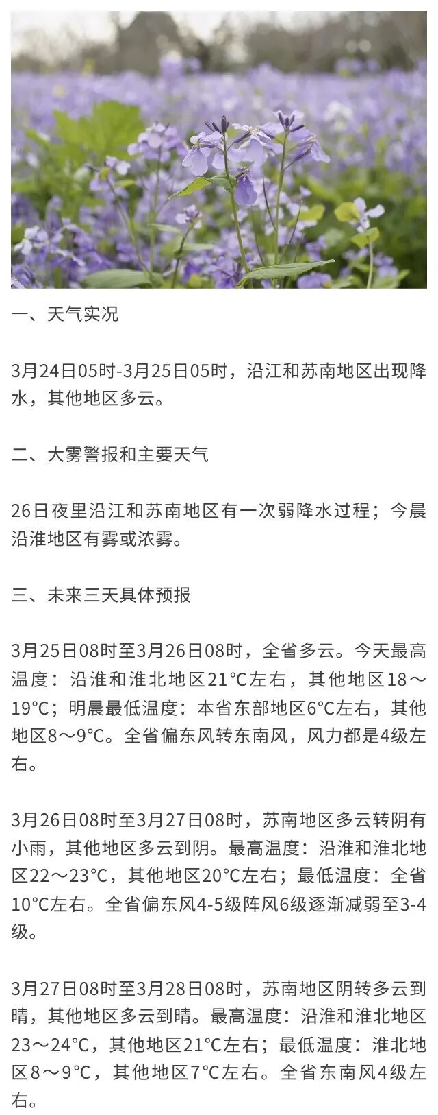3月25日08时至3月26日08时,全省多云。今天最高温度:沿淮和淮北地区21℃左右,其他地区18~19℃;明晨最低温度:本省东部地区6℃左右,其他地区8~9℃。全省偏东风转东南风,风力都是4级左右。