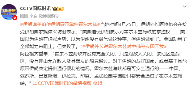 当地时间3月25日,伊朗外长阿拉格齐在接受伊朗国家媒体采访时表示,“美国迫使伊朗展示对霍尔木兹海峡的掌控权——美国以为伊朗在虚张声势,以为伊朗没有勇气做这种事,但伊朗做到了。美国动用了全部能力来阻止,但失败了。”