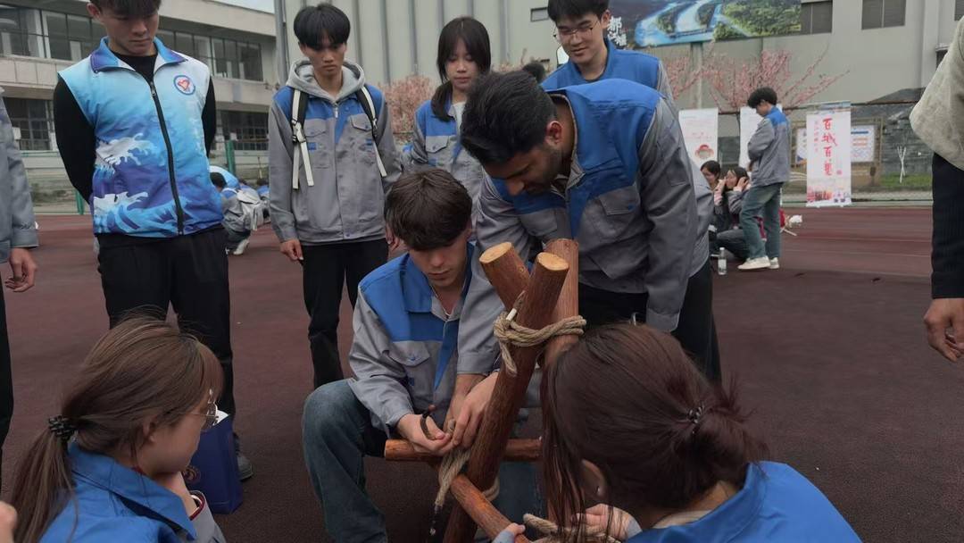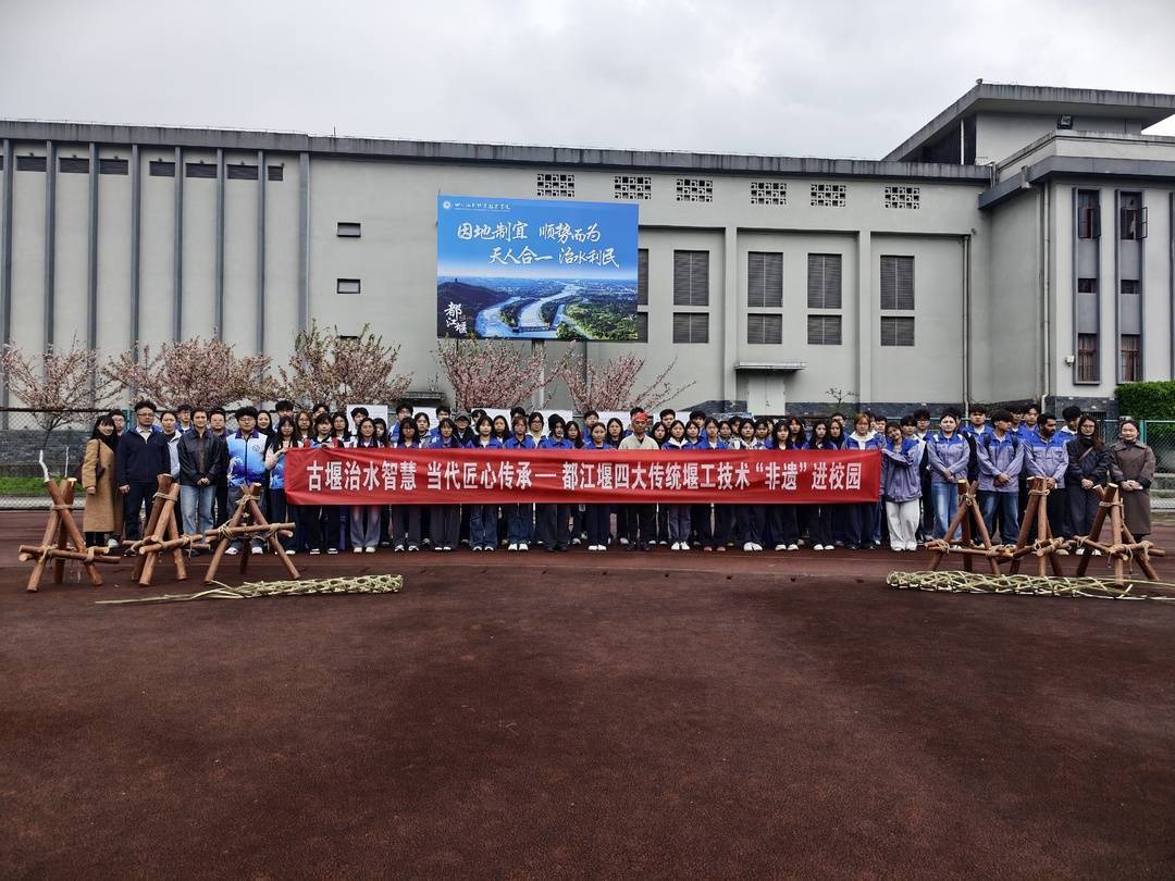 在四川水利职业技术学院都江堰校区运动场,省级非遗代表性项目都江堰“四大传统堰工技术”传承人肖云发等专家现场指导,学子们分8组开展竹笼、杩槎编制的实操体验。大家尝试搭建杩槎,领会传统技艺“就地取材、以柔克刚”的生态理念,感受治水智慧中“减缓水势、精准截流”的科学内涵。参与体验的智慧水利专业学生符自华表示,两千多年前的古人能凭借朴素的智慧实现科学治水,且技艺沿用至今,既心生敬佩,也让自己对水利专业的传承与创新有了新思考。