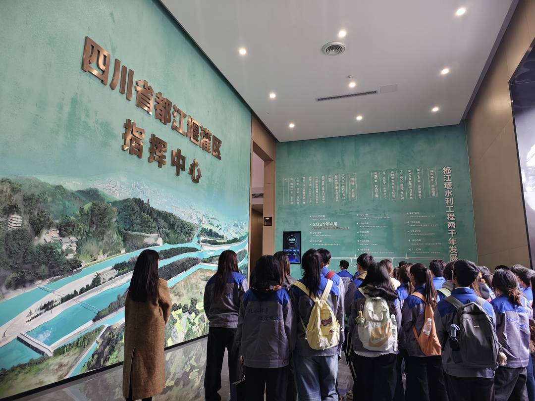 在四川省都江堰水利发展中心指挥中心,师生们观摩了数字孪生实景建模系统、远程闸门控制系统、水资源调度可视化平台等现代化设施。工作人员结合实时监测数据和调度案例,详细讲解了中心在水资源精细化调度、水旱灾害防御、灌溉供水保障等方面的功能作用,展示了都江堰灌区作为国家水网重要组成部分,如何通过信息化、智能化手段实现“一屏观全域、一网管全域”的现代化管理目标。从千年古堰的传统智慧到数字水利的科技赋能,学子们直观见证了传统水利工程与现代水网建设的深度融合。电力系统自动化专业学生卫骞文感慨,此次研学让自己跳出课堂理论,开始思考如何将古人“治水惠民”的初心融入新时代水利发展,让水利技术更好地造福于民。