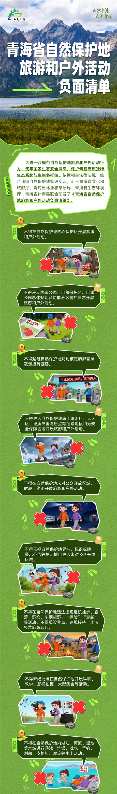 为进一步规范自然保护地旅游和户外活动行为,筑牢国家生态安全屏障,保护青藏高原独特生态系统与生物多样性,依据相关法律法规,结合我省自然保护地管理实际,制定本负面清单,现印发给你们,请认真贯彻执行。