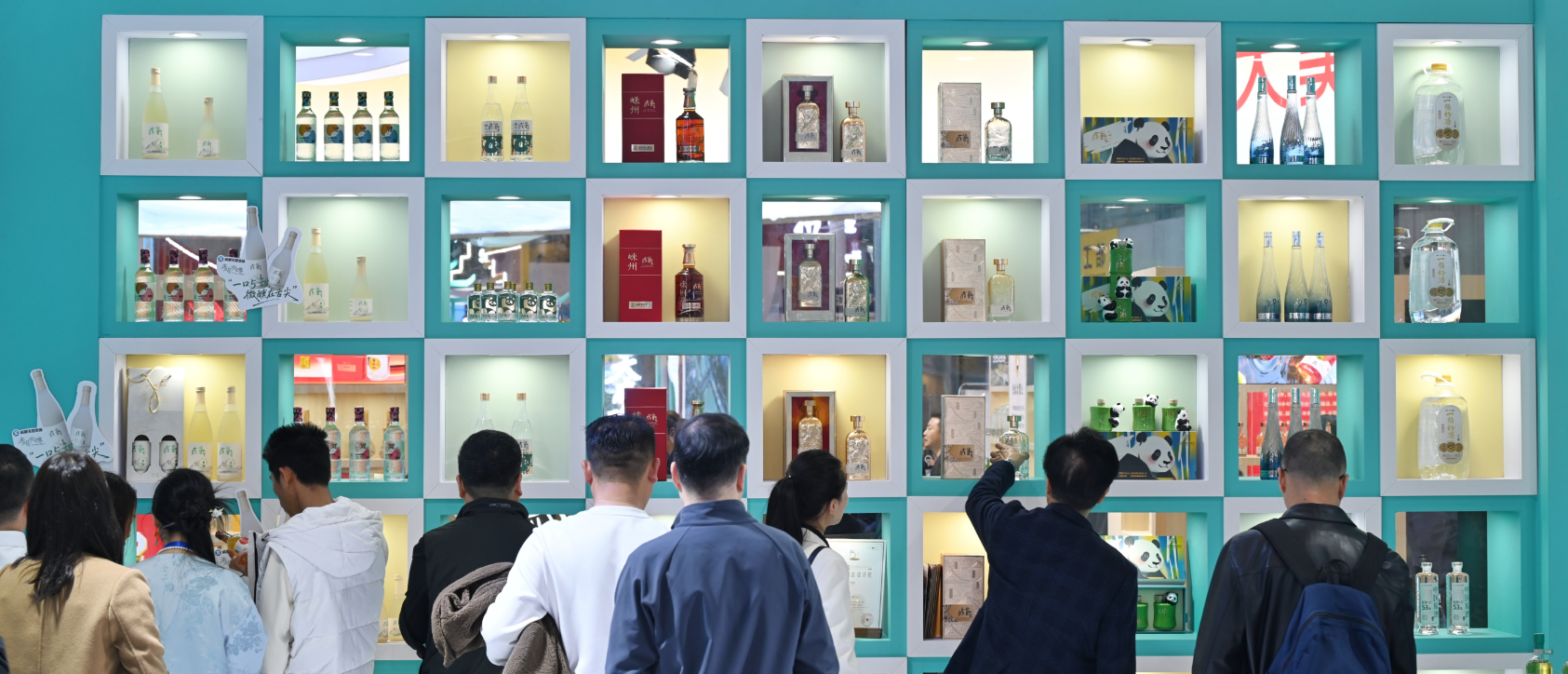 展馆一隅,“万酒LOGO墙”由数十款本土酒品牌标识拼贴而成,成为视觉焦点。工作人员介绍,邛崃在保持传统白酒优势的同时,正大力发展国际烈酒、低度潮饮、果酒等新酒饮品类,以满足多元化市场需求。