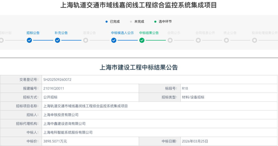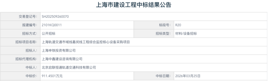 3月25日,上海轨道交通市域线嘉闵线工程综合监控系统两个标段同日发布中标结果公告,合计金额约4800万。
