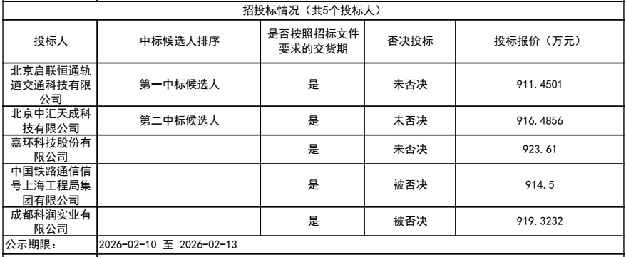 根据2月10日至13日的评标结果公示,共有5家单位投标。北京启联恒通轨道交通科技有限公司为第一中标候选人,北京中汇天成科技有限公司为第二中标候选人,投标报价916.4856万元。嘉环科技股份有限公司投标报价923.61万元。中国铁路通信信号上海工程局集团有限公司、成都科润实业有限公司两家单位的投标被否决。