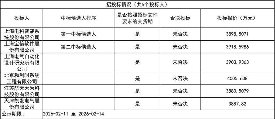 根据2月11日至14日的评标结果公示,共有6家单位参与投标。上海电科智能系统股份有限公司为第一中标候选人,上海宝信软件股份有限公司为第二中标候选人,投标报价3918.5986万元。其余4家投标单位及报价分别为:上海电气自动化设计研究所有限公司3903.9363万元、北京和利时系统工程有限公司4005.608万元、江苏航天大为科技股份有限公司3880.5079万元、天津凯发电气股份有限公司3887.82万元。
