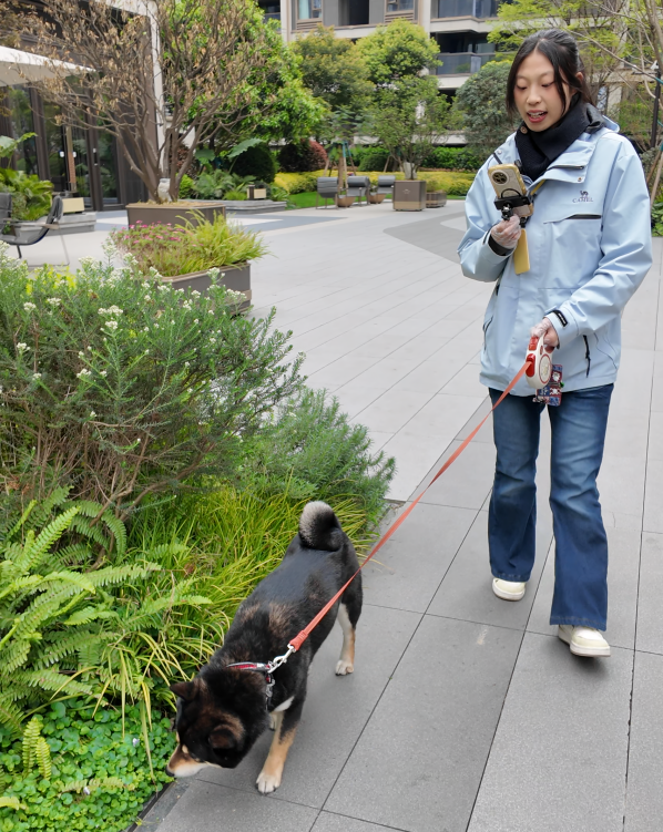 雪梅先给旺仔喂食。吃饱后,便带它出门活动。旺仔一路上不断拉扯牵引绳,雪梅需要时刻跟上它的节奏。为了随时清理粪便,她随身携带便便垃圾袋。遛狗过程中,她会不时抚摸旺仔,用轻快的语气与它互动。