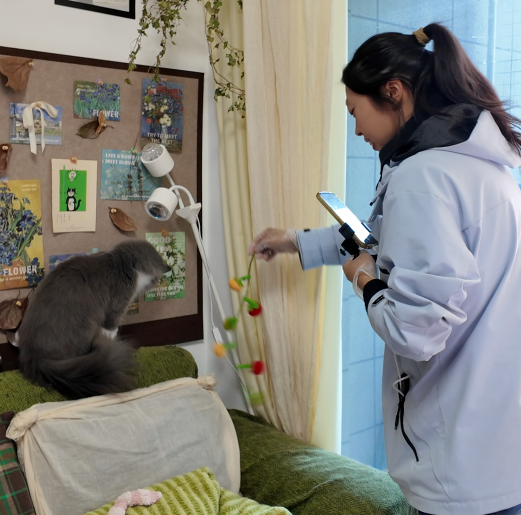 作为“临时家长”,宠托师在服务过程中需要全程录像。粮碗里的新粮、水碗里的净水、猫砂盆清理后的样子……每个环节都会拍下特写,宠物主人通过视频能实时看到这一切。