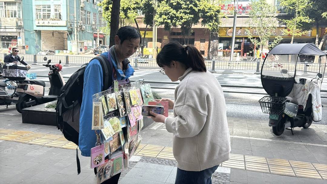 这名游客来自福建,她告诉记者,自己是在小红书刷到大叔的故事,很受触动。刚好这两天在成都玩,于是一早专门来寻找大叔,找了两圈才把大叔找到,买几个冰箱贴回去送给朋友留作纪念。