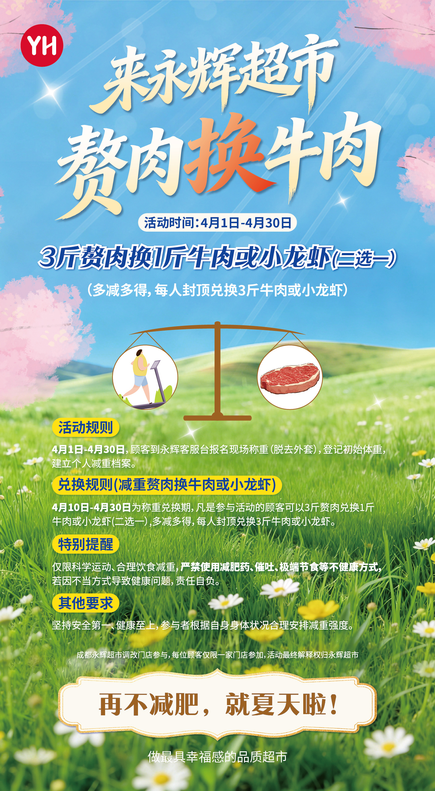 近日,江苏省无锡市梁溪区山北街道“赘肉换牛肉”的健康减重挑战赛火爆全网。不少四川网友直呼羡慕,声称自己也想参加。日前,成都永辉超市门店的线下宣传海报显示,顾客可在成都永辉超市门店参与“赘肉换牛肉”活动,减重3斤换1斤牛肉。