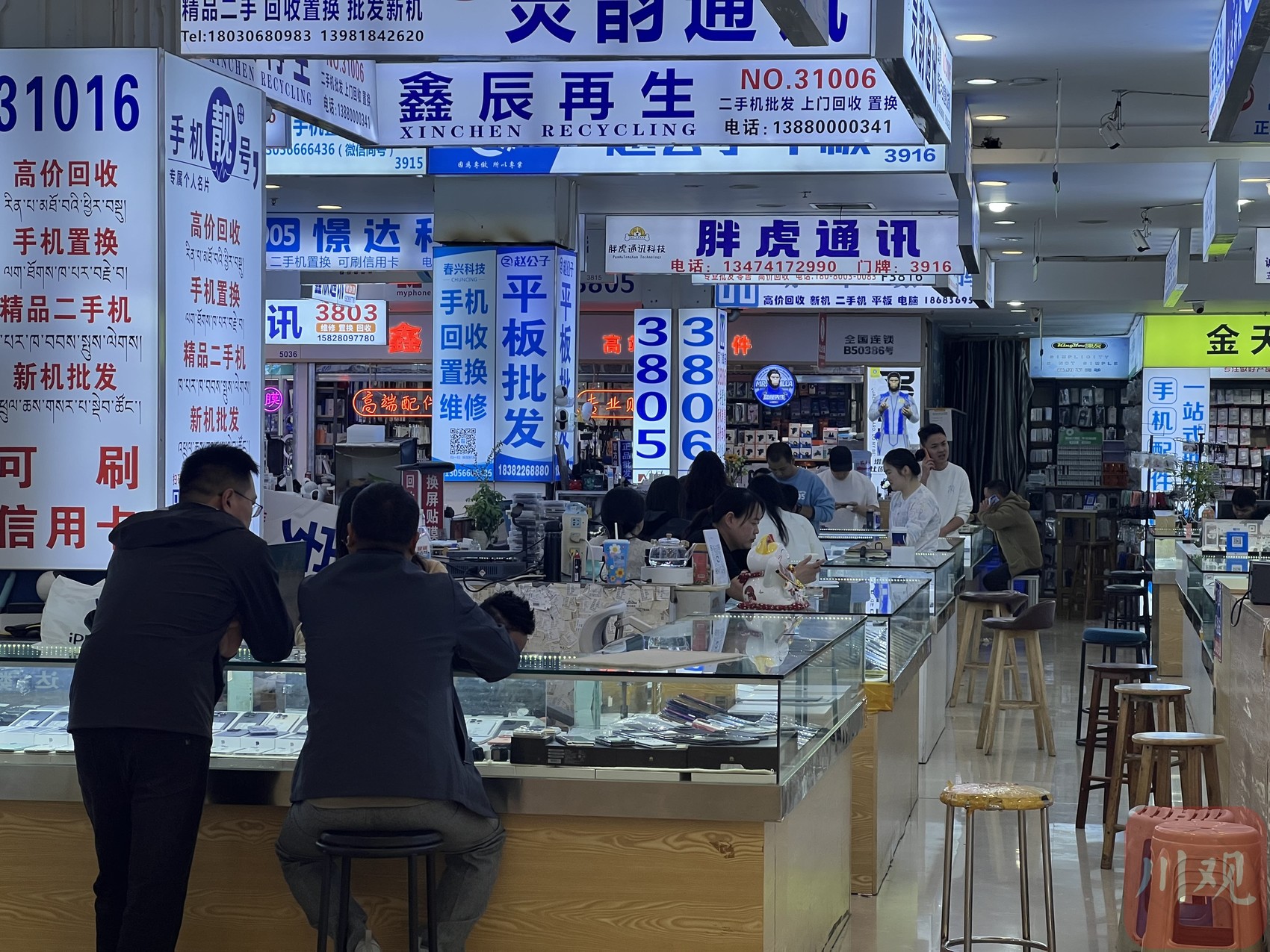 在成都太升南路赛格广场,多家手机回收店铺前围着前来出售、购买二手手机的市民。