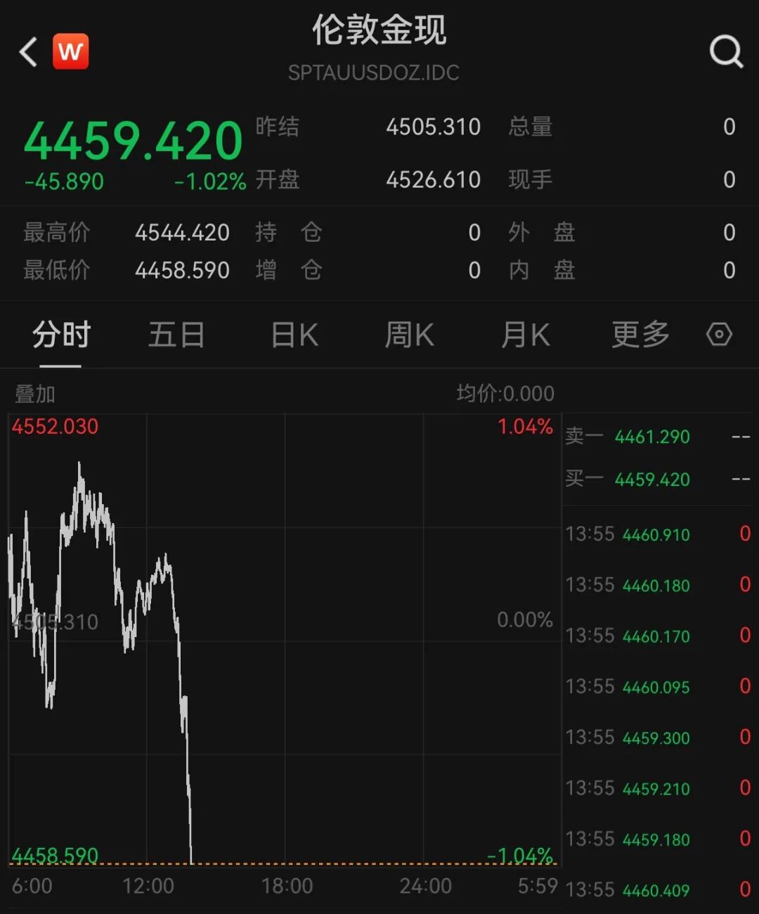 3月26日盘中,现货金银短线走低,现货黄金回落至4460美元/盎司下方,日内跌1.02%。