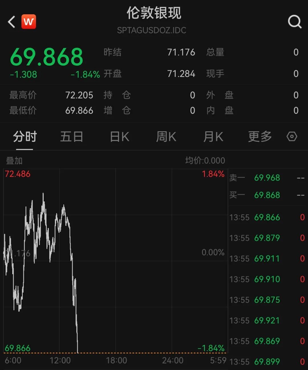 现货白银回落至70美元/盎司下方,日内跌1.84%。