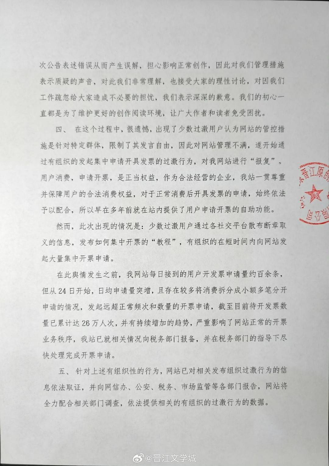 说明称,目前出现了少数过激用户认为网站的管控措施是针对特定群体,限制了其发言自由,因此对网站管理不满,遂开始通过有组织的发起集中申请开具发票的过激行为,对我网站进行“报复”。少数过激用户通过各社交平台散布断章取义的信息,发布如何集中开票的“教程”,有组织的在短时间内向网站发起大量集中开票申请。在此舆情发生之前,网站每日接到的用户开发票申请量约百余条,但从24日开始,日均申请量突增,且存在较多将消费拆分成小额多笔分开申请的情况,发起远超正常频次和数量的开票申请,截至目前待开发票数量已累计达26万人次,并有持续增加的趋势,严重影响了网站正常的开票业务秩序,网站已就相关情况向税务部门报备,并在税务部门的指导下尽快处理完成开票申请。