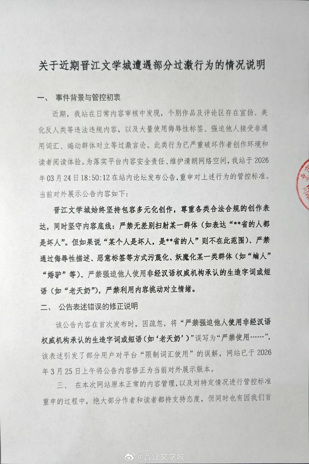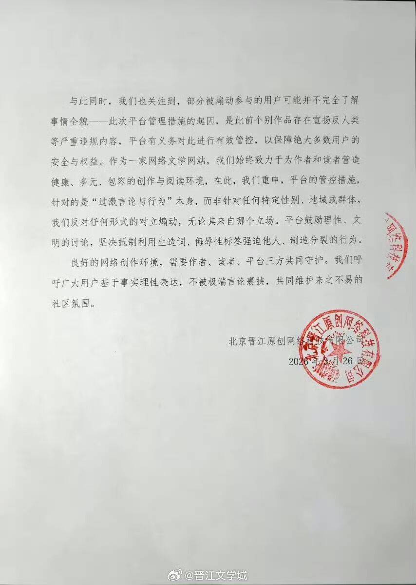 3月26日晚,根据晋江文学城发布“关于近期晋江文学城遭遇部分过激行为的情况说明”,称个别作品及评论区存在宣扬、美化反人类等违法违规内容,以及大量使用侮辱性标签、强迫他人接受非通用词汇、煽动群体对立等过激言论。此类行为已严重破坏作者创作环境和读者阅读体验。为落实平台内容安全责任、维护清朗网络空间,晋江文学城站于2026年03月24日18:50:12在站内论坛发布公告,重申对上述行为的管控标准。