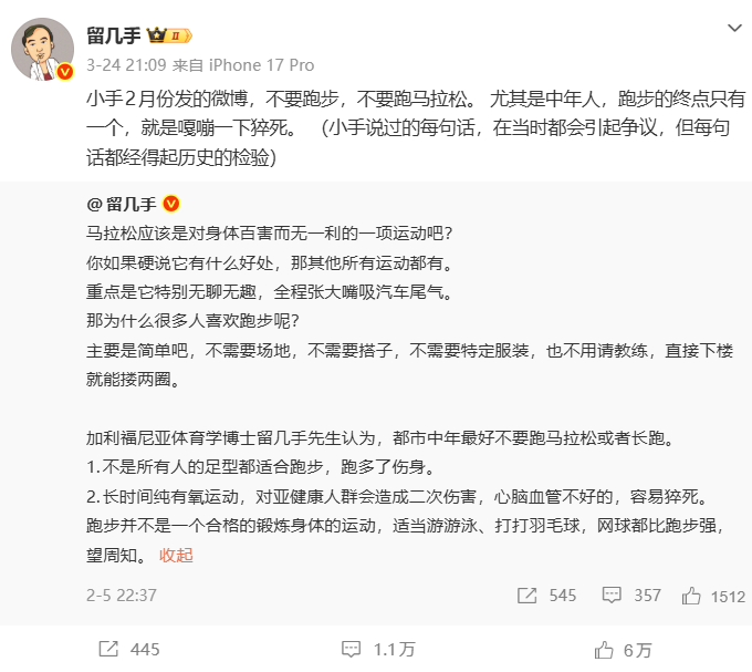 24日晚,留几手发微博称“不要跑步,不要跑马拉松”,被网友解读为影射张雪峰。截至发稿前,该微博仍在其微博主页可见。