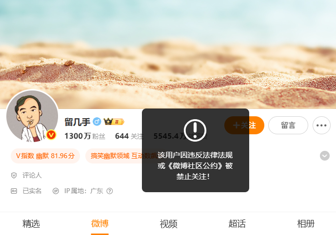 当记者尝试关注“留几手”的微博账号时,系统会弹出提示:“该用户因违反法律法规或《微博社区公约》被禁止关注” 。