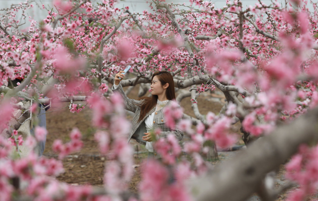 3月26日,一名游客在河南省焦作市温县黄河街道东张王庄村桃园赏花拍照。
