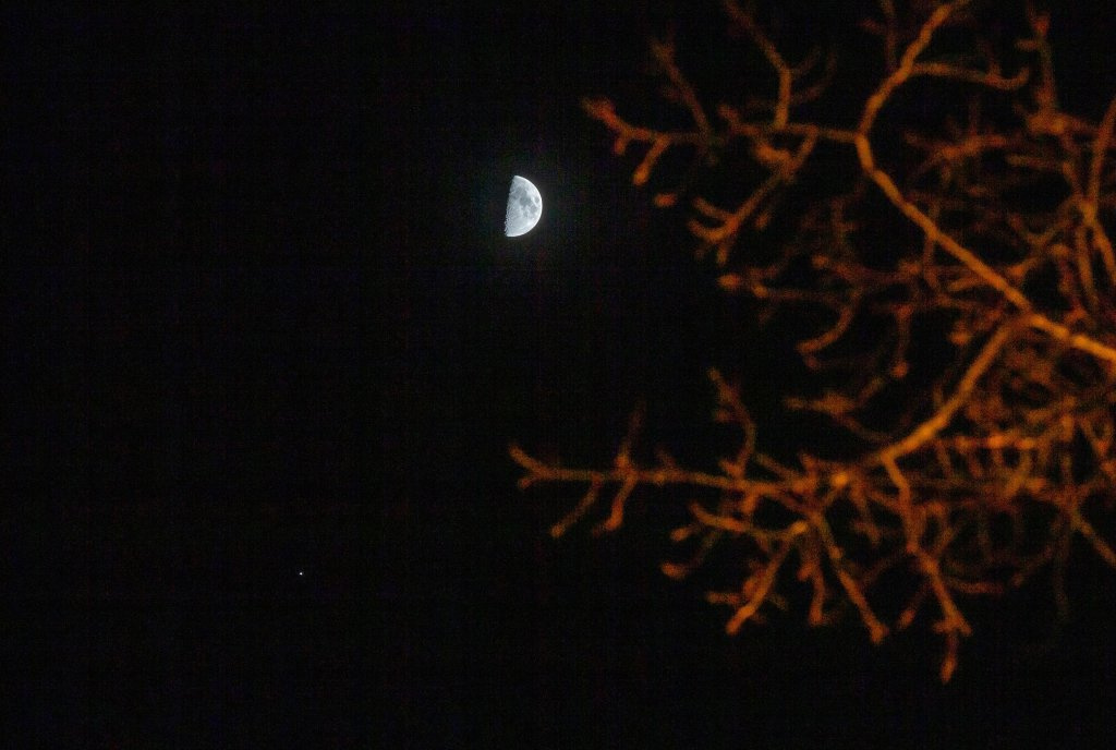3月26日,太阳系八大行星中体积最大的木星与一轮上弦月相合。当天日落后,上弦月与木星一同出现在天顶,在双子座中相伴,献上了一场高颜值的“星月对话”。