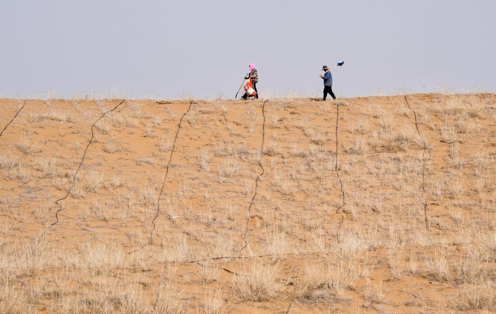 近日,随着天气转暖,宁夏中卫市组织治沙工人开展宁夏境内腾格里沙漠固沙锁边带补种补植工作,通过及时补种耐旱沙生植物,不断巩固治沙成果,筑牢黄河上游生态屏障。