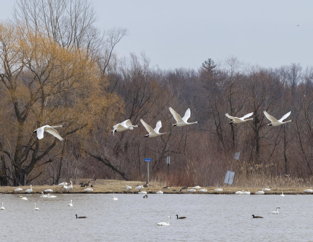 每年2月至4月,众多苔原天鹅在加拿大安大略省埃尔默野生动物管理区短暂“歇脚”,再继续北行。苔原天鹅繁殖地接近北极圈苔原地带,由于体重较轻,迁徙距离长达五六千公里。