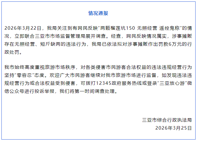 据“三亚发布”微信公众号消息,3月25日,三亚市综合行政执法局发布情况通报,2026年3月22日,三亚市综合行政执法局关注到有网民反映“两颗榴莲坑150 无照经营 遥控鬼秤”的情况,立即联合三亚市市场监督管理局展开调查。经查,网民反映情况属实,涉事摊贩存在无照经营、短斤缺两的违法行为,我局已依法拟对涉事摊贩作出罚款6万元的行政处罚。