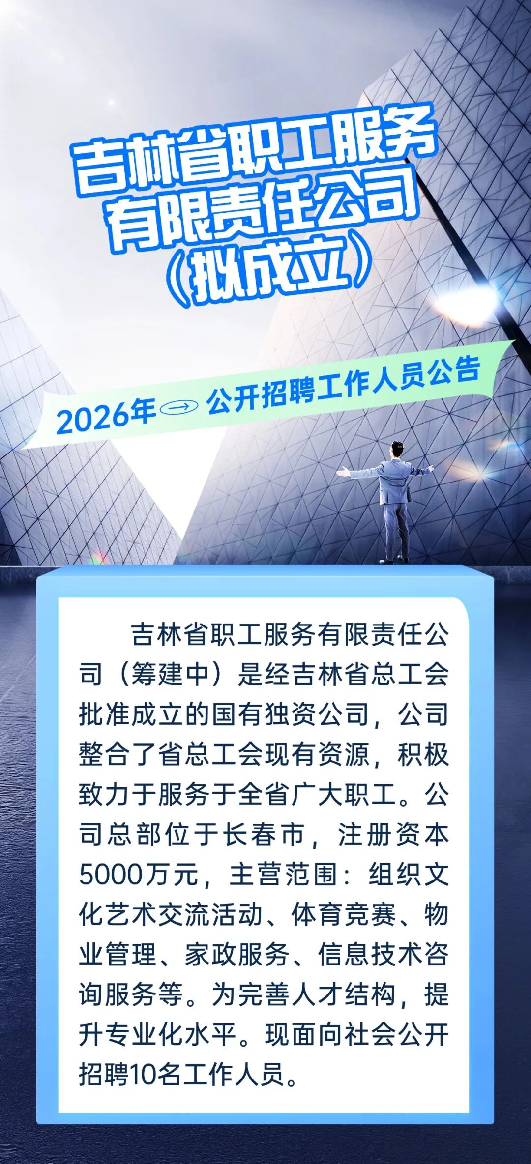 原文标题:吉林省职工服务有限责任公司(拟成立)2026年公开招聘工作人员公告