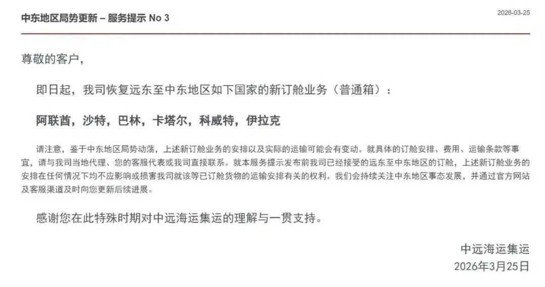 3月25日,中远海运集运在公司网站发布消息称,即日起,恢复远东至中东地区如下国家的新订舱业务(普通箱),包括阿联酋、沙特、巴林、卡塔尔、科威特、伊拉克。