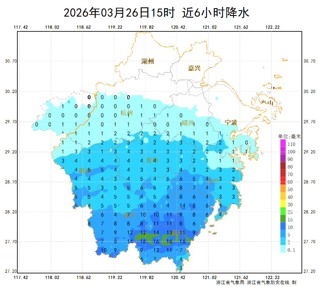 昨日午后,除了浙北北部地区,我省大部已被雨水淋过了,雨水发力区锁定浙南,部分出现中雨。截至26日15时,近6小时累计雨量最大为温州平阳县水头新安站20.3毫米。
