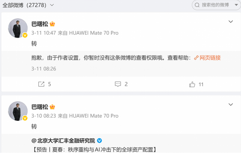 巴曙松本人的微博自3月11日起停更。