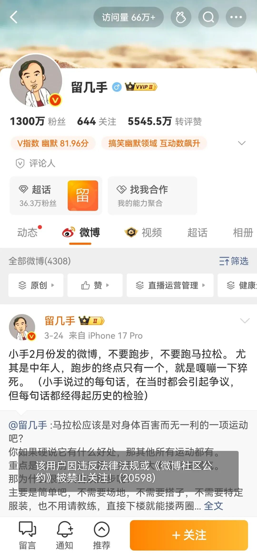 3月26日,千万粉丝网红留几手(本名刘爽)微博账号被禁止关注。