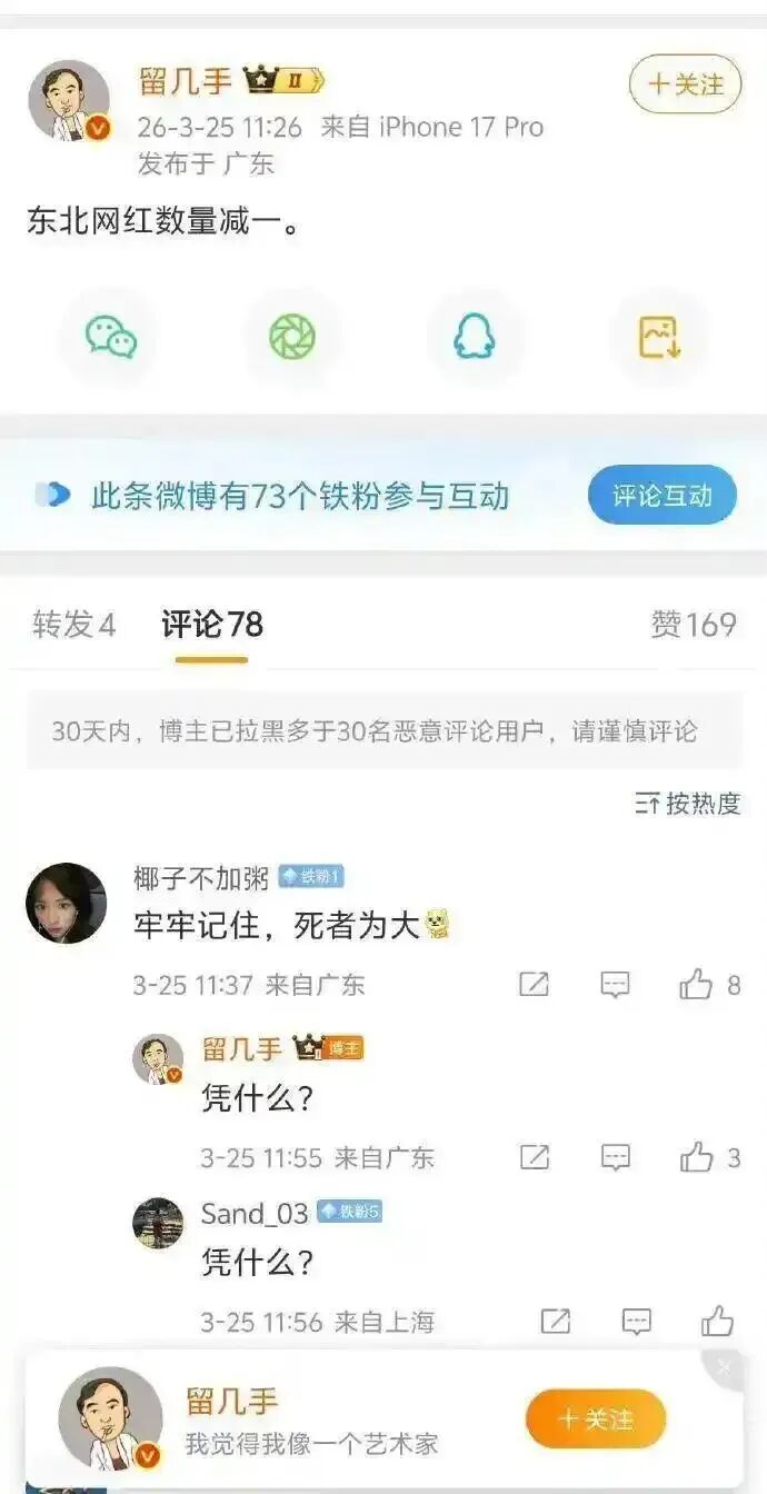 3月25日,“留几手”疑因在微博对张雪峰猝然离世事件发表争议言论引发众怒。目前,相关微博已被删除。