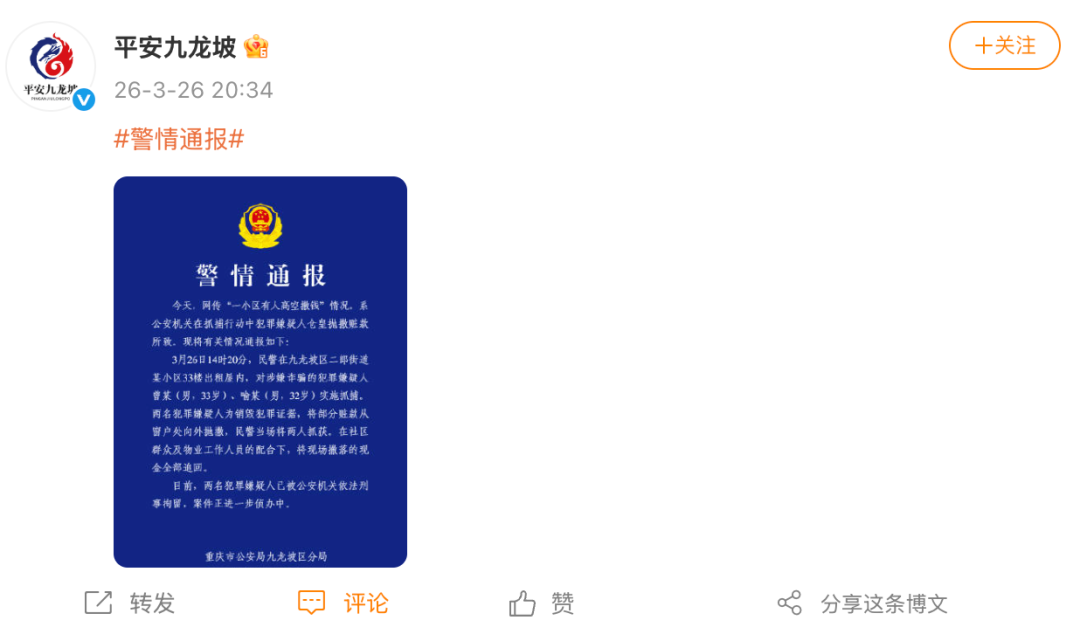 重庆警方通报“一小区有人高空撒钱”:系犯罪嫌疑人仓皇抛撒赃款所致