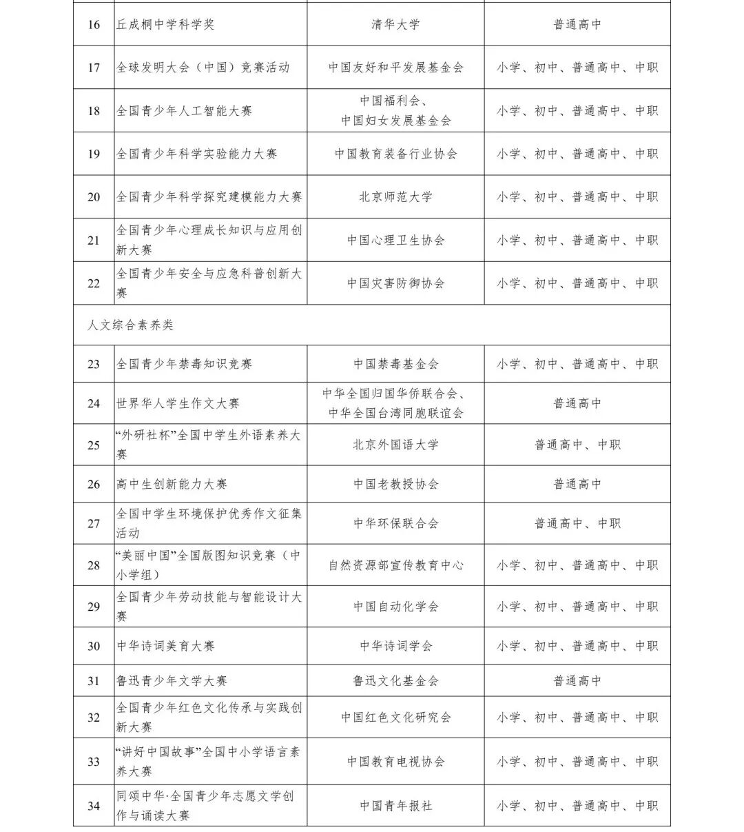 一、严控竞赛总量。严格控制面向全省中小学生开展各类竞赛活动,切实减轻中小学校、学生和家长负担。未经省教育厅批准,任何单位不得擅自组织面向中小学生的全省性竞赛活动,各地各校不得组织或动员中小学生参加不在公布名单内的各类竞赛活动。除教育部有文件要求外,原则上不以省为单位统一组织中小学生参加其他全国性的竞赛活动。