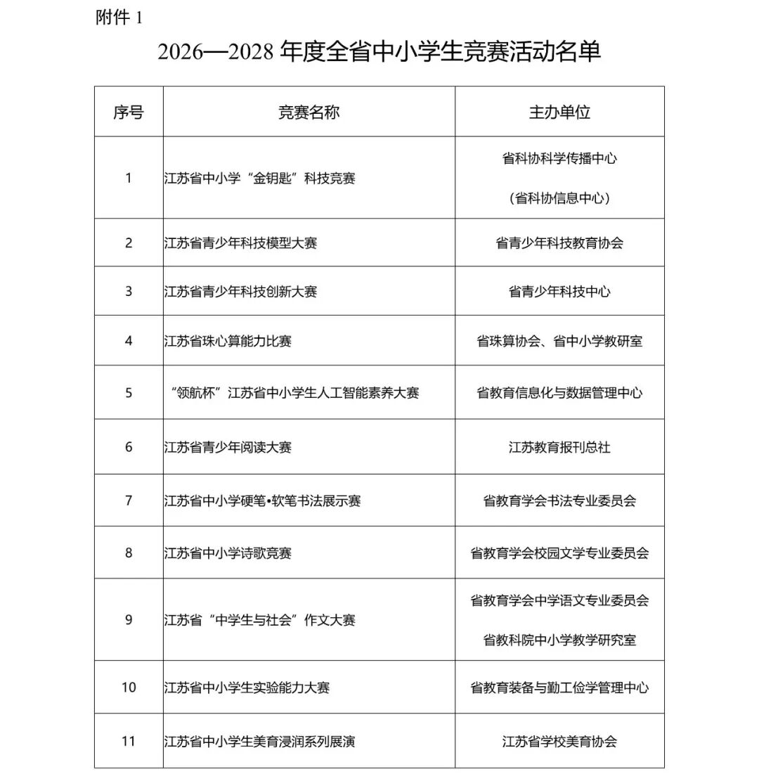 3月25日,江苏省教育厅网站发布《省教育厅办公室关于公布2026—2028年度全省中小学生竞赛活动的通知》。