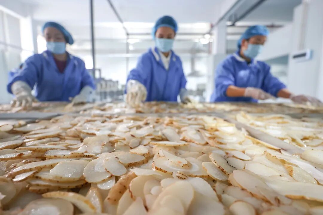 工人在贵州两山天麻产业有限公司生产车间分拣天麻切片。(陈曦 摄)
