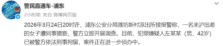 3月25日,上海市公安局浦东分局通报,3月24日20时许,浦东公安分局潍坊新村派出所接报警称,一名来沪出差的女子遭同事猥亵,警方立即开展调查。目前,犯罪嫌疑人左某某(男,42岁)已被警方依法刑事拘留,案件正在进一步侦办中。