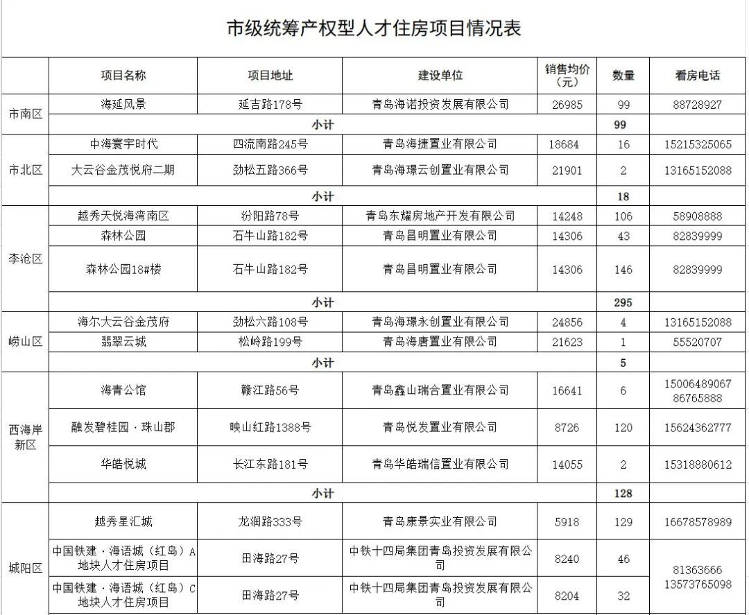 青报君注意到,情况表中包括市南区1个项目、市北区2个项目、李沧区3个项目、崂山区2个项目、西海岸新区3个项目、城阳区3个、高新区3个项目、莱西市1个项目。名单中既有这些在售产权型人才住房项目的名称、具体地址,还包含建设单位、销售均价、数量以及看房电话。