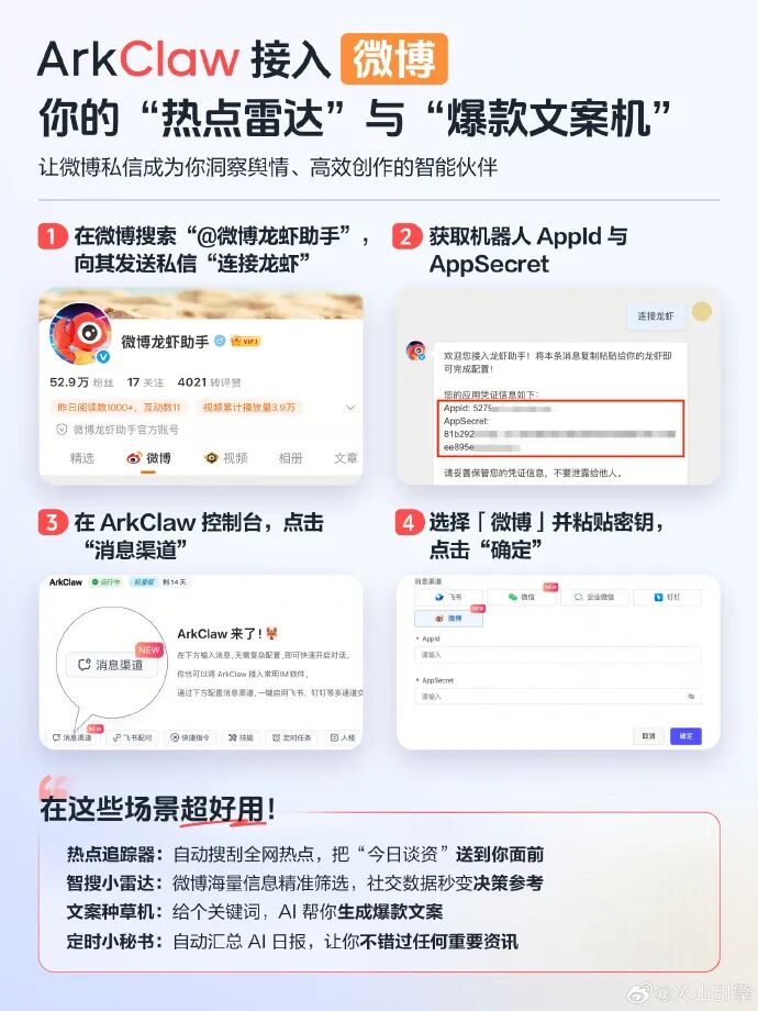 用户只需在微博私信@微博龙虾助手,发送"连接龙虾"指令获取AppId和AppSecret,随后在ArkClaw"消息渠道"中选择"微博"平台并粘贴密钥,单击"确定"即可完成连接。配置完成后,用户即可在微博内与ArkClaw展开对话交互,享受便捷的AI服务体验。