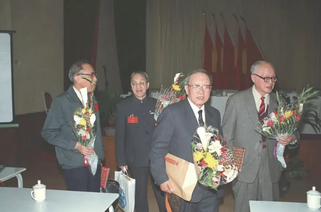1991年4月25日,王淦昌、王大珩、杨嘉墀、陈芳允(右起)获得“863”计划荣誉证书。